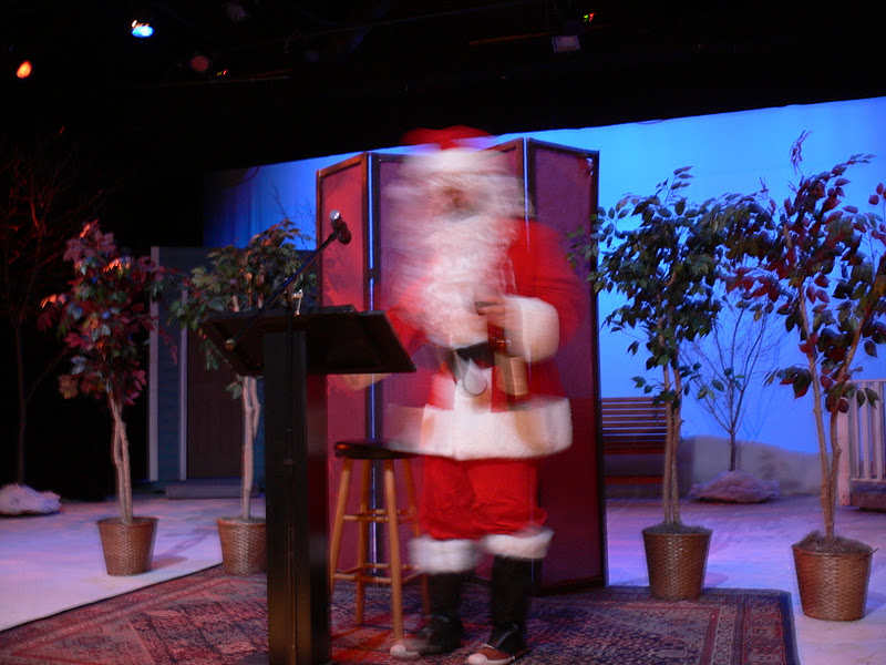 Sarah's husband, Travis dressed up as the "Bad Santa emcee" and did roasting-style intros... (er, don't ask about the bottle he's holding...)