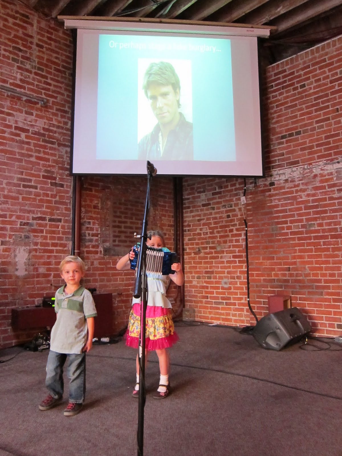 The little kid crowd had fun playing their own music and dancing and running around on and off-stage... (Yes, that's an image of MacGyver in the background, hehehe.... we had a slide show running with photos of Maria's life, some of which you can see here and link to from here ...)