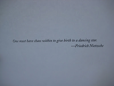 Here's the epithet (is that what it's called and how you spell it? i think so...) It has to do with one of the themes of the book-- learning to embrace the delicious mess of life. That's something I've often struggled with. Right now, especially, I'm in the midst of lots of chaos-- living in a rental house while our house is being majorly renovated... my stuff mostly in boxes in storage, not knowing where anything is...now just waiting for that dancing star to be born...