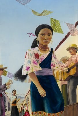 I also appreciated the beauty of the cover, but agreed that it looked younger than the intended audience. Also, the girl's outfit doesn't reflect Maria Virginia's indigenous Quichua clothing, which is important in the story, since it relates to her identity issues. We would've wanted to be sure that the girl's clothing on the cover accurately represented the culturally-specific clothing that Maria Virginia and other Otavalena Quichua women wear-- solid white blouse with wide lace ruffle around the neck and forearms of the blouse, a ring of flowered embroidery below the lace of the neck, gold bead necklaces and coral-colored bead bracelets. If you go to Otavalo, you'll see that although there are slight variations on the smaller details, that women stick very closely to the basic clothing that you see Maria Virginia wearing here: