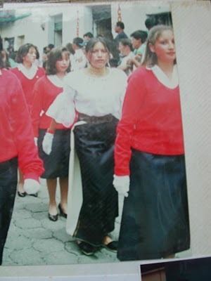 During the 6-year process of writing the book, we had plenty of time to imagine what the cover might look like. I thought it would be good to incorporate a photo of Maria Virginia as a teen, to remind readers that this is a true story, that Virginia is a real person. We did have a few wonderful photos that were taken over 15 years ago by photographers of a French magazine for a feature article on a Queen competition in Otavalo (Maria Virginia doesn't remember which mag and doesn't have a copy of the mag-- only the photos.) Here's one of the photos, which was used in an Otavalo newspaper article from years ago: