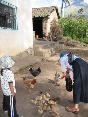 feeding chickens with her son at his paternal grandparents' house