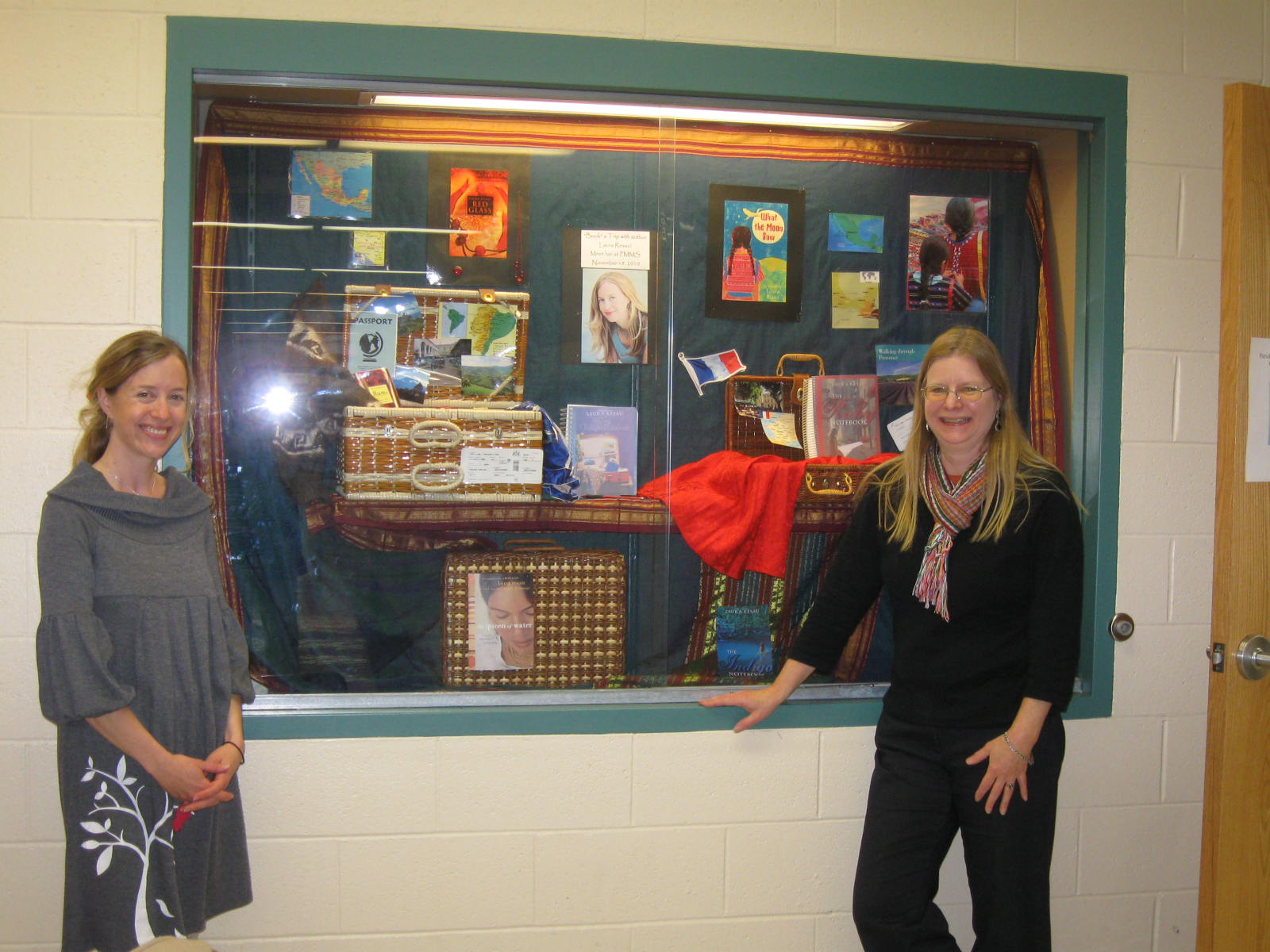 Sandy and me in front of another amazingly creative display she made with her class (this one features all my books!):