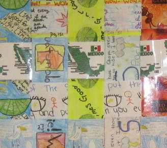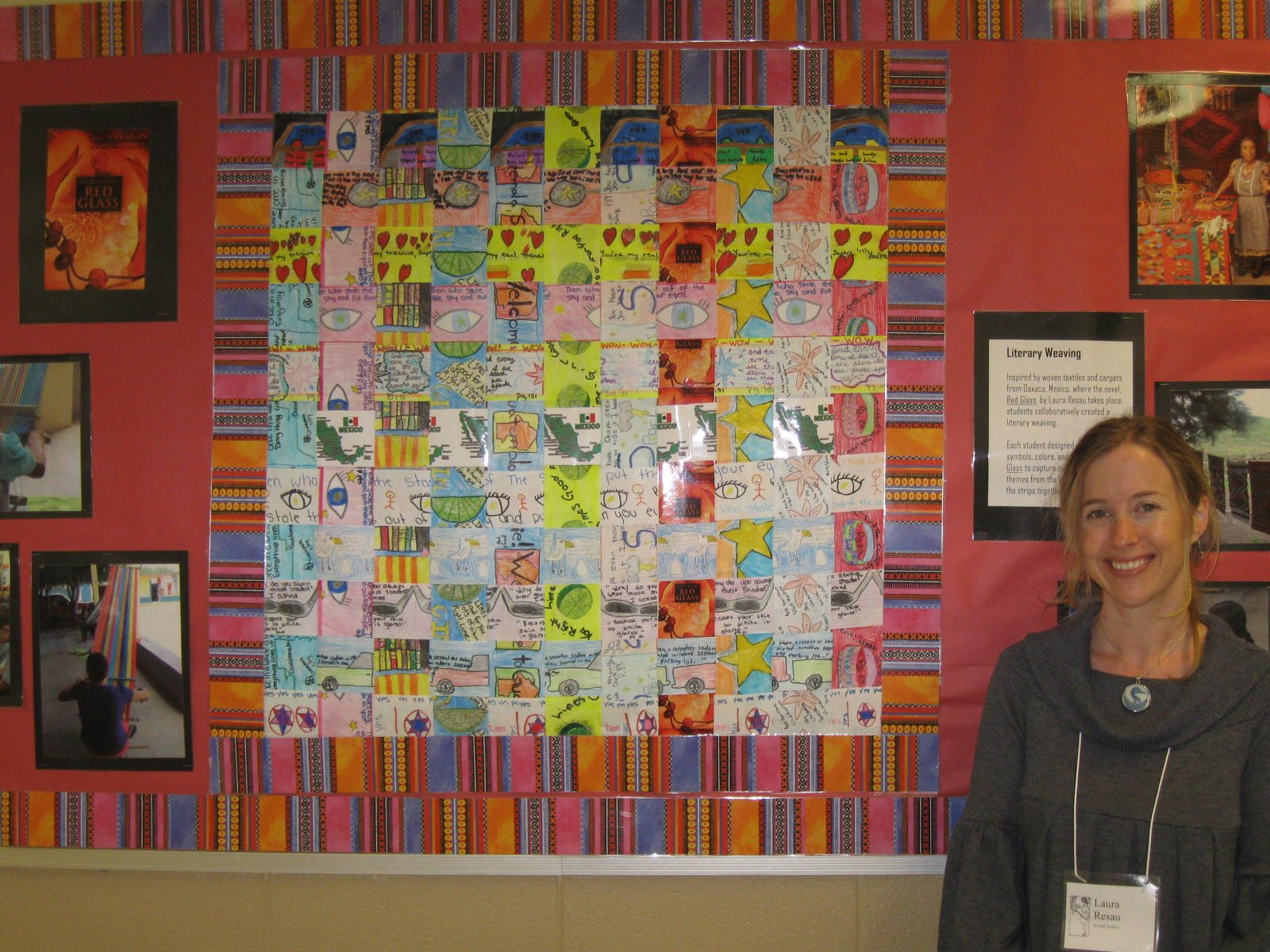 Inspired by woven textiles and carpets from Oaxaca, Mexico, where the novel Red Glass takes place, students collaboratively created a literary weaving. Each student designed a strip of repeated symbols, colors, and quotes from Red Glass to capture significant images and themes from the book. Then students wove the strips together.