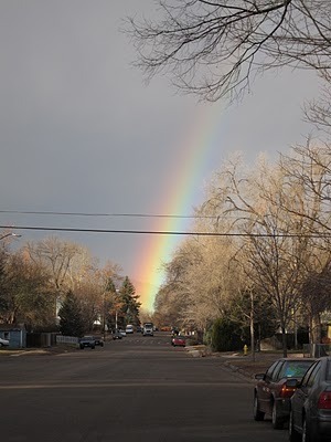 And I'm grateful for the little everyday joys that come with living where I do, at the foot of the Rockies... There are rainbows galore here. We saw this full rainbow arc at the end of our street one morning last week. It took our breath away. Lil Dude and I stood in the middle of our street for a while, in a state of wonder. "That's so cool, Mommy!" he kept saying. Of course, he wanted to follow the rainbow, find where it touched down...