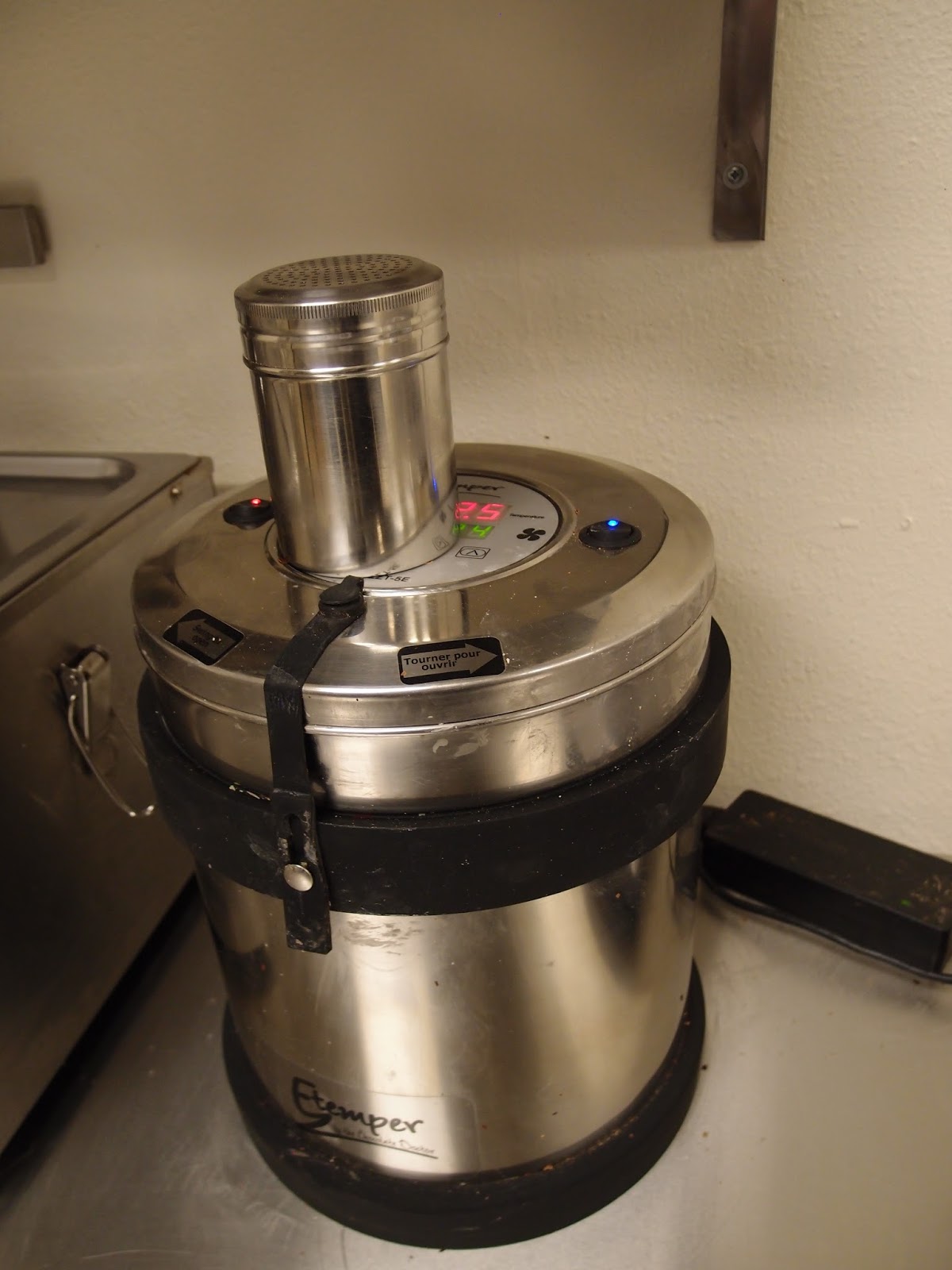 This is the final step-- tempering, which means the controlled melting and cooling of the chocolate. Here are the tempering units, with extremely precise temperature controls. The chocolate can stay in here for about an hour, or, can be set on overnight mode.