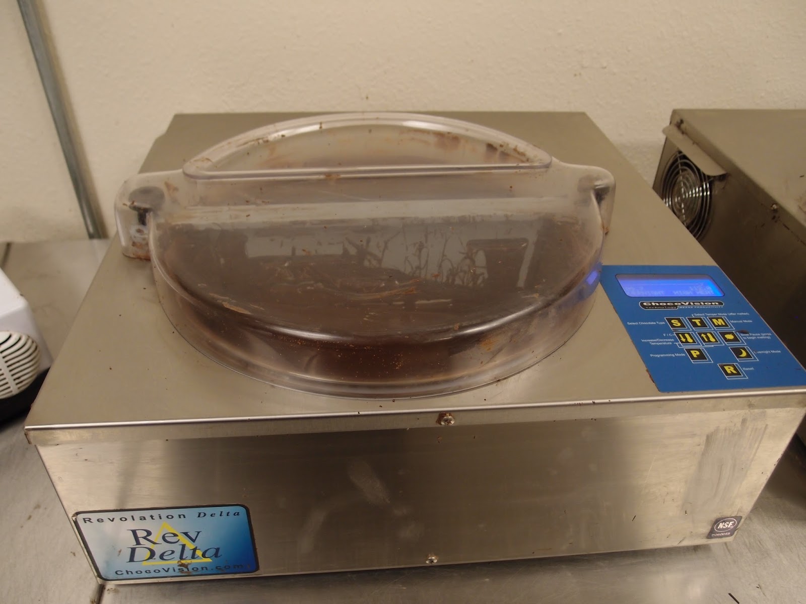 Toby let us do a taste test here (!!!)-- we tasted chocolate from one melanger that was only done half of its final 90 hour timeline. We noticed that it tasted kind of fruity and bright-- it still tasted of some compounds that interfered with the intended final, smooth, rich taste. It also still had a slightly gritty texture.