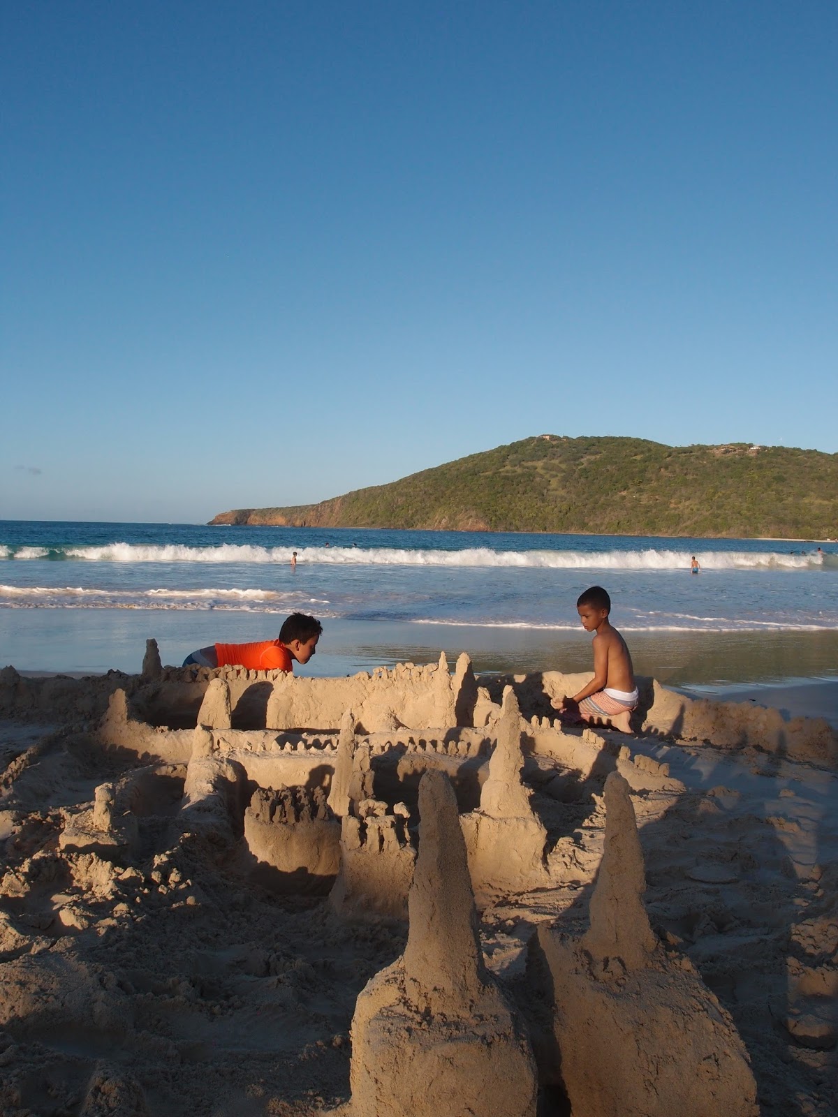 Lil Dude dug holes and built sand castles... here he made a new, local friend. He got to use some Spanish to make plans to fortify the walls. :-)