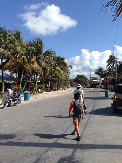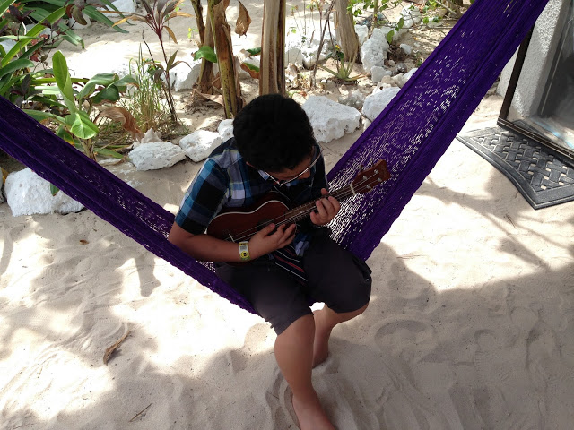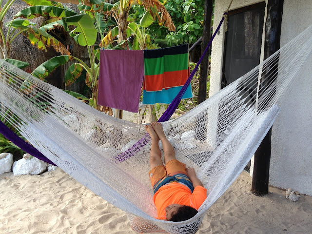 We stayed at a sweet little guesthouse called Mango Fish. Our idyllic routine involved snorkeling in the mornings, having lunch in town, having relaxing siesta time (I read and wrote, Ian slept, Lil Dude read and wrote and played video games), then going for a late afternoon swim, then heading to dinner in our golf cart (aka "this bad boy.") Lil Dude loved the golf cart-- one evening, as we were getting buckled in, he took a blissful breath and said, "A starry night, going out to dinner in this bad boy.... does life get any better?"
