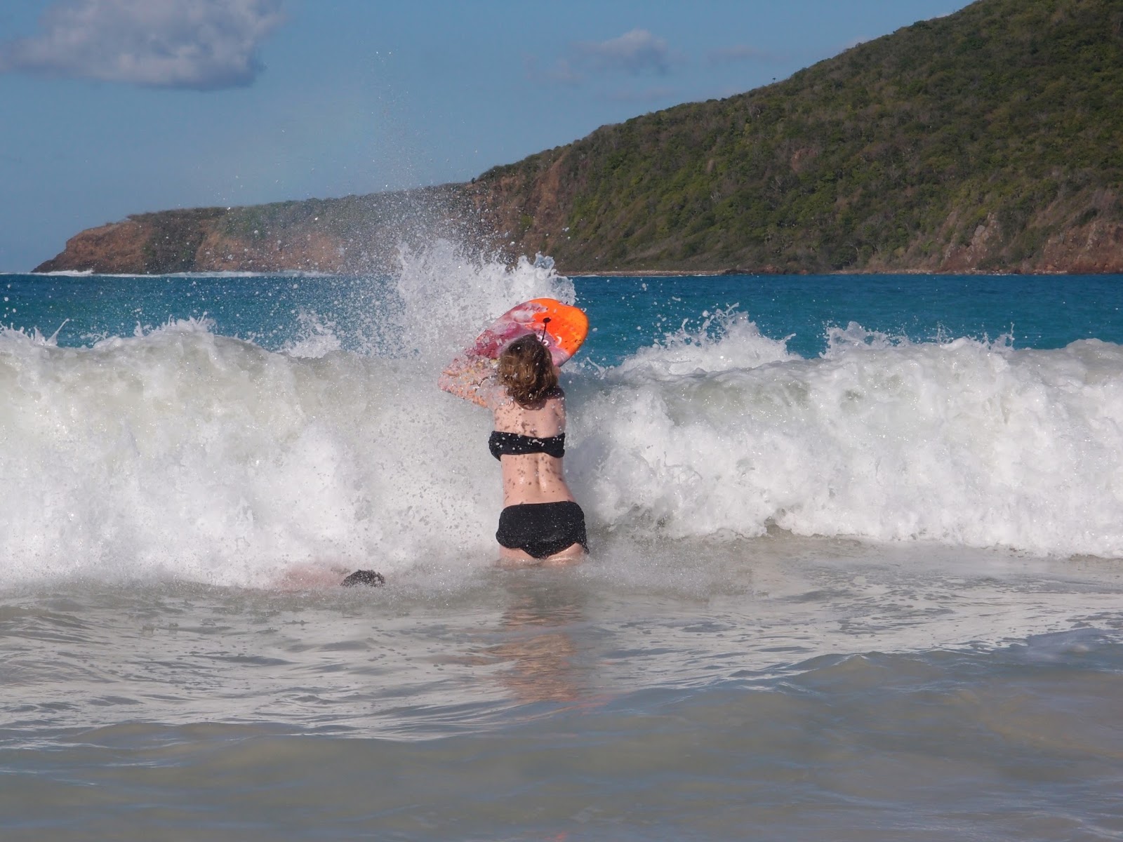 Lil Dude really enjoys getting "battered" by waves, and enjoys it even more when I get battered. (Below, he's been knocked over and I'm about to join him...)