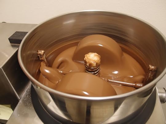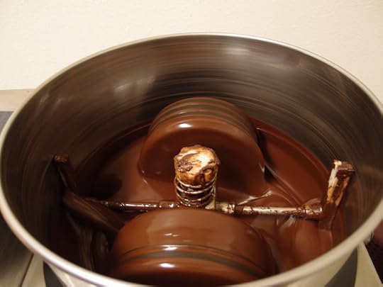 The chocolate liquor and sugar are poured into the melanger (see below) for between 60 and 90 hours, depending on the particular kind of bean. For days, the particles of cacao and sugar are ground down to between 20-30 microns (itty-bitty), so that the chocolate feels silky-smooth on your tongue. This process also helps release the volatile compounds and aromatics, while aerating and oxygenating the chocolate. Note the chocolate's temperature here-- just pleasantly warm, a touch above room temp, but not hot.