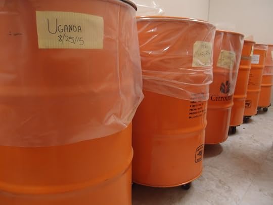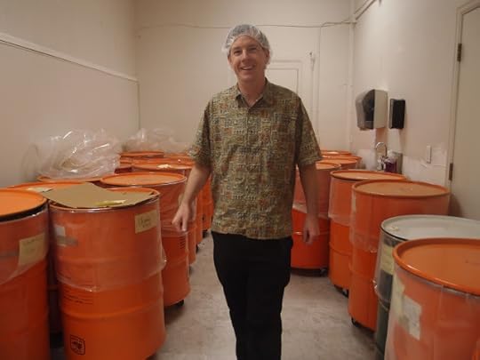 Okay, back to the tour... The cacao beans are harvested and fermented onsite in Latin America and Africa, then shipped here in giant sacs. Toby and his wife Alix and their few employees then put the beans in the barrels, keeping them carefully separated. In order to avoid any icky chemicals, they use natural dry ice to prevent any insect infestations during this stage.