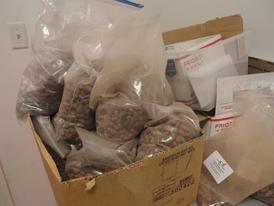 They are also continually getting in new shipments of sample beans from potential growers to work with.... they come in wee batches (see above). Toby and Alix make a small, test batch (1-5 lbs) of chocolate with the beans to see if they're good enough to order in bigger quantities to use in the chocolate they sell. Only 15-20% of the beans they try out pass this test... the bar is high!