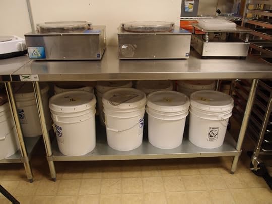 If Toby's making milk chocolate, this melanger stage is where he adds the powdered whole milk, specially ordered from Europe. You can see it's lighter in color than the pure dark chocolate above.