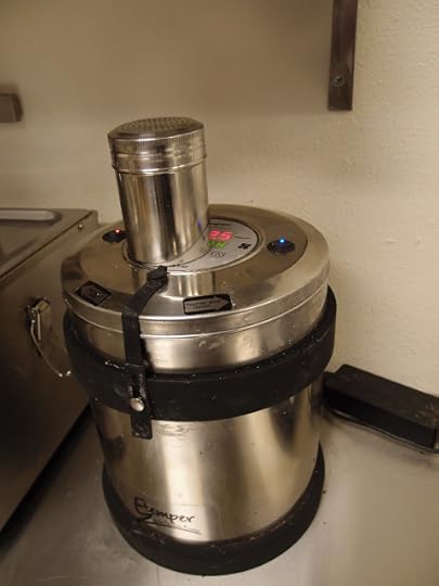 Okay, so next, the cooled, now-brittle beans are cracked into nibs and separated from the husks. Toby is also a self-taught inventor and creative collaborator of sorts-- important skills for small-batch chocolate makers. With the help of resources online, he came up with a cool, hand-made machine to do the cracking and winnowing.... involving a Champion juicer, a specialty vacuum, and a blade device custom made on his 3-D printer (all approved by the FDA and the CO health dep't!) The core component of this winnower was designed and made by John Nanci (the godfather of small batch chocolate). Toby's modifications included the additional 3-D printed parts and other parts.