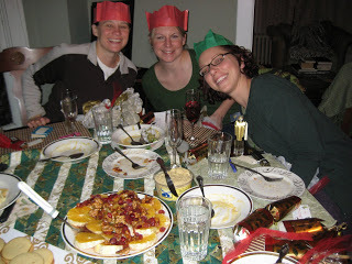 Sarah Ryan, Molly Reid, Kimberly Srock Fields donning paper crowns that flew out of our exploding golden rocket tubes--apparently an English tradition (see remnants in lower right corner)