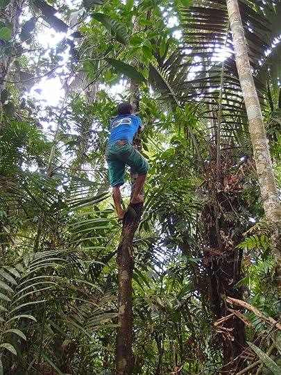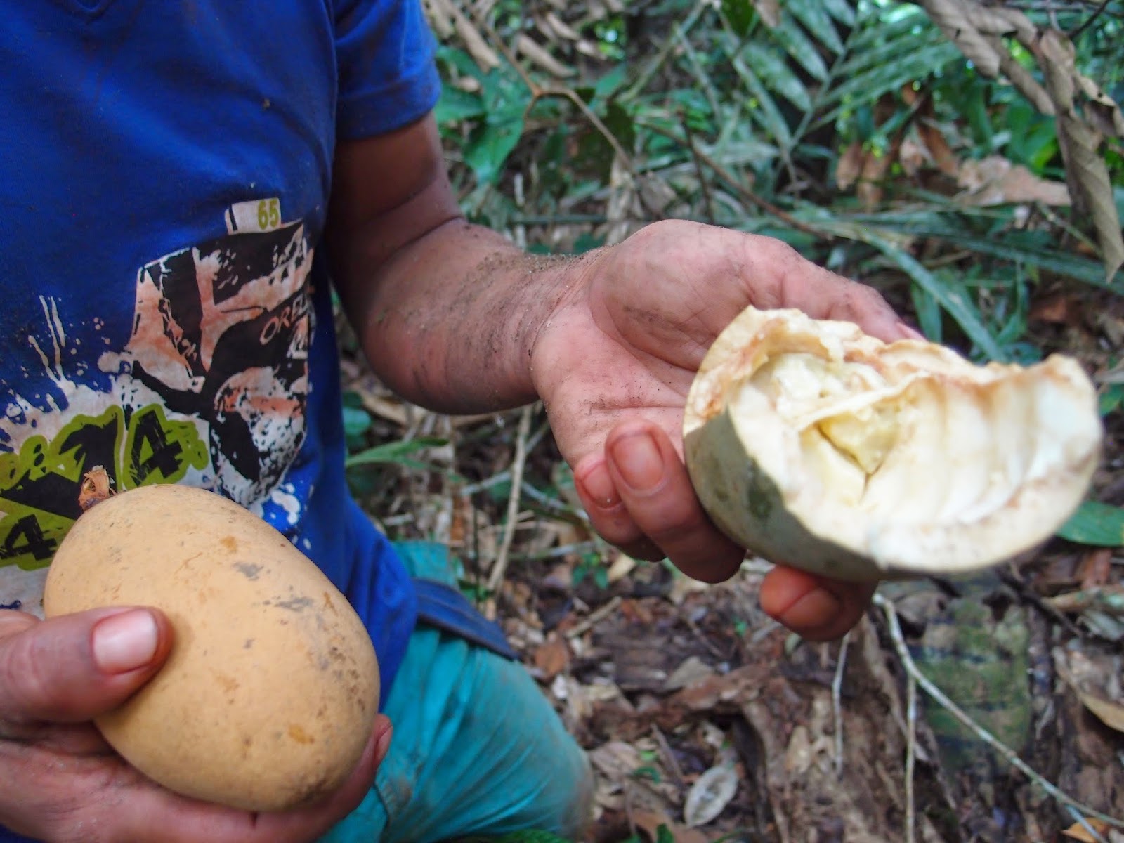 With amazingly keen eyes, Pegonka spotted some fruit in the treetops and climbed up several stories to retrieve it. He tossed it down to us, far below.