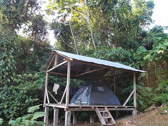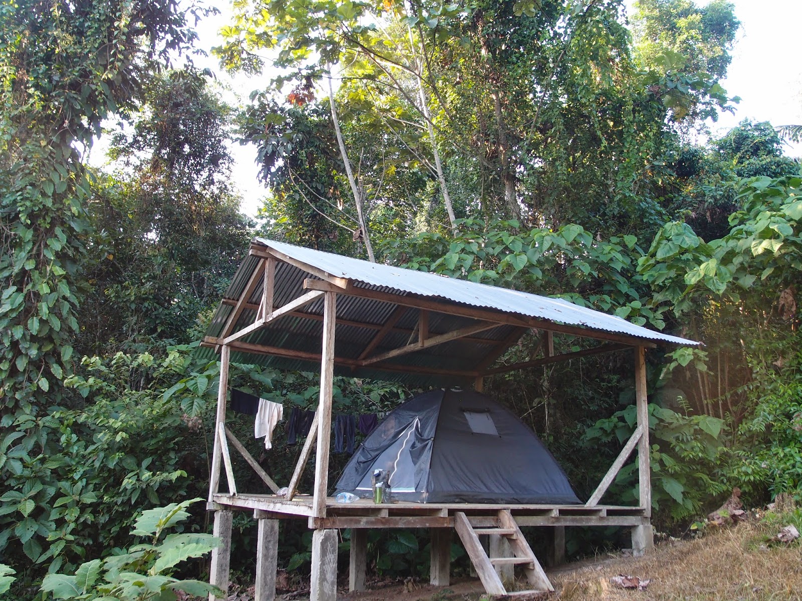 Our lodging situation was great-- tents to keep out the bugs, a nice platform and roof... and just down the hill were some showers and bathroom stalls... luxurious camping!