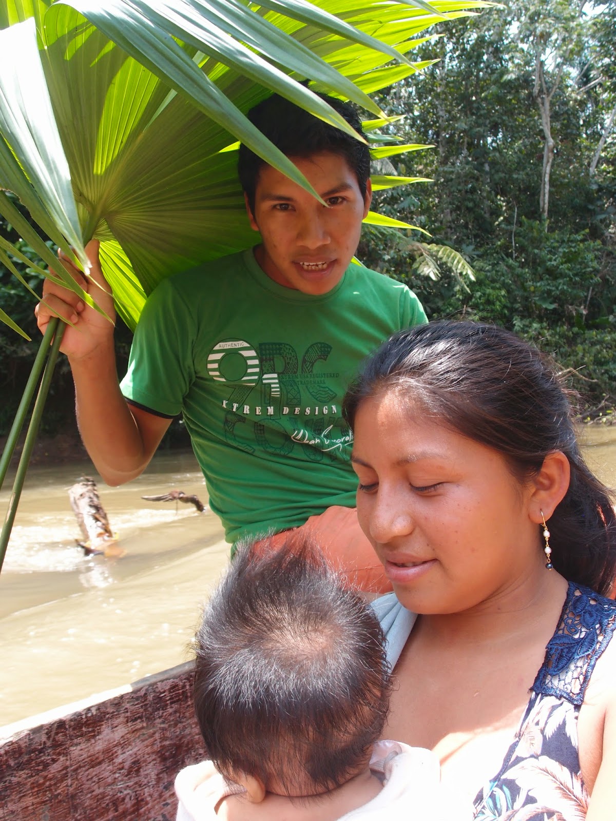 Here's Pedro, shielding his wife, Elizabeth, and their baby from the sun with a palm leaf in the canoe...