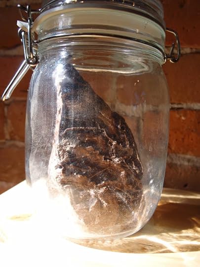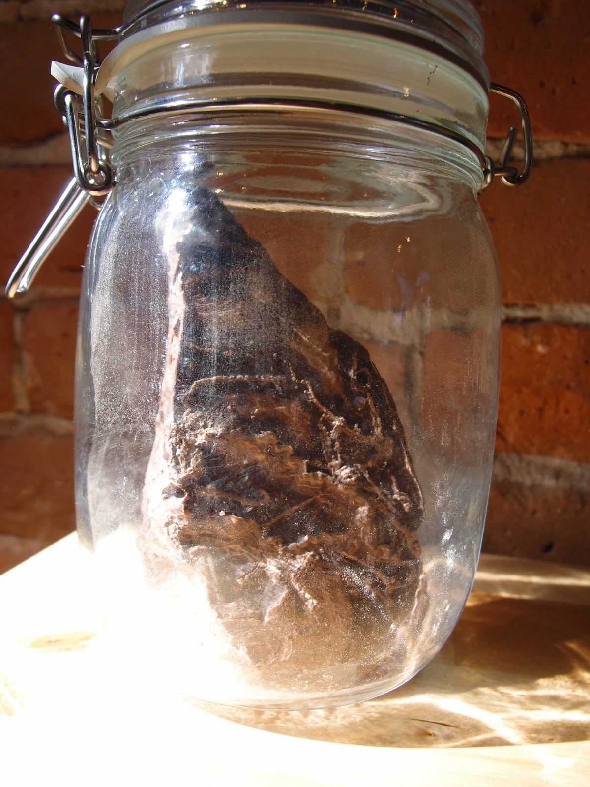 You're left with giant chunks of chocolate, which are part of the "geology phase" of chocolate making. You can see the mottling and striated patterns in the chocolate chunk, a result of the "blooming" process. This happens because the cocoa butter parts of the chocolate crystallize at room temperature.