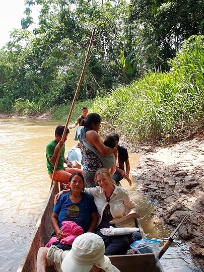 I sat next to Inez for these last hours in the canoe, and we had fascinating conversation about the past few decades of Waorani history in this territory. I won't get into all the nitty gritty details here (you can read the book ironically titled SAVAGES if you're interested), but suffice to say that the various cultural groups in this area have a gory history of spearing each other on sight. In the past several decades, a tentative peace has been reached, and there has been some intermarriage. Inez has a Quichua husband, for example. (Note that culturally, the Amazonian Quichua are very different from the Andean Quichua in my book THE QUEEN OF WATER.)