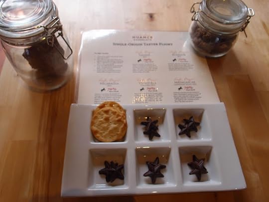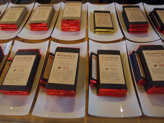 I tasted chocolate made with beans from Ghana (rich, deep, notes of vanilla, cherries, and honey), Ecuador (earthy, mysterious, subtle), Nicaragua (smooth and creamy with notes of tobacco leaf, nuts, molasses), Venezuela (beautifully balanced, notes of cashews and dairy cream), and Madagascar (fascinating, sophisticated layers of flavor like plum and apricot.) Not surprisingly, Toby has a creative writing background. :-)