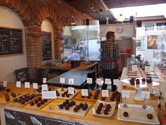 I spent a glorious morning at Nuance on Pine Street in Old Town, Fort Collins. One of the settings in my novel-in-progress is a chocolate shop, and I felt the need to spend some quality time inside of one. The owners are Alix and Toby, a married couple who put their hearts into running this business. I was so grateful to Toby, who took time out of his morning (2 and a 1/2 hours!) to enthusiastically answer my many interview questions.