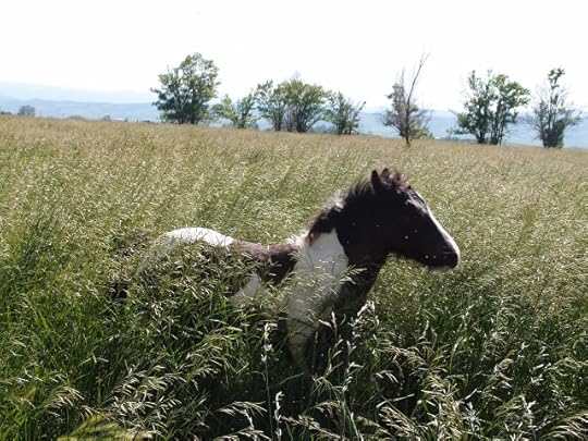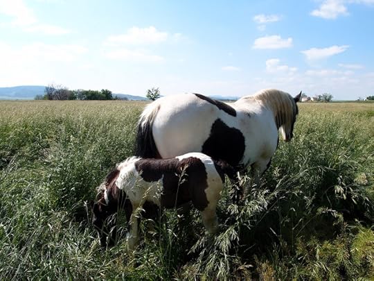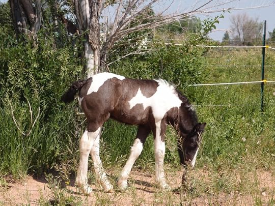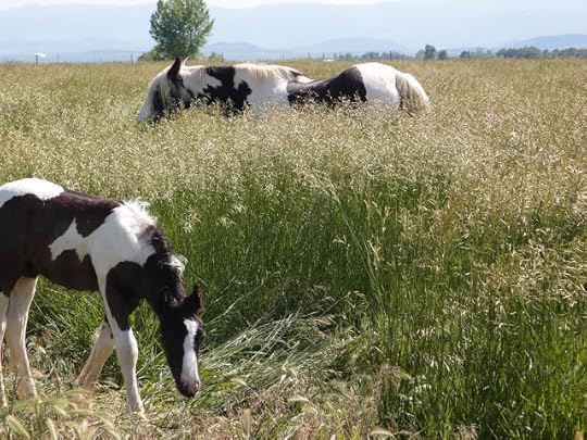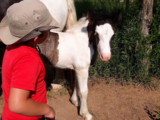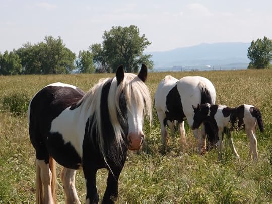 So, more about these beautiful foals: The older of the two-- about three weeks old in these photos-- is named Skellig Michael (Skeilig Mhichil in Irish), which is also a rocky island in Ireland. The 2-week-old girl is named Saoirse (pronounced Searrrsha), which means "freedom" in the Irish language, and has cool political/historical significance in Ireland.