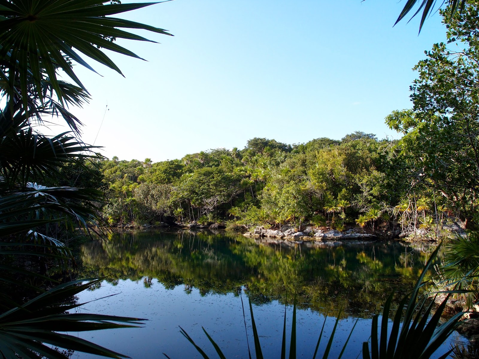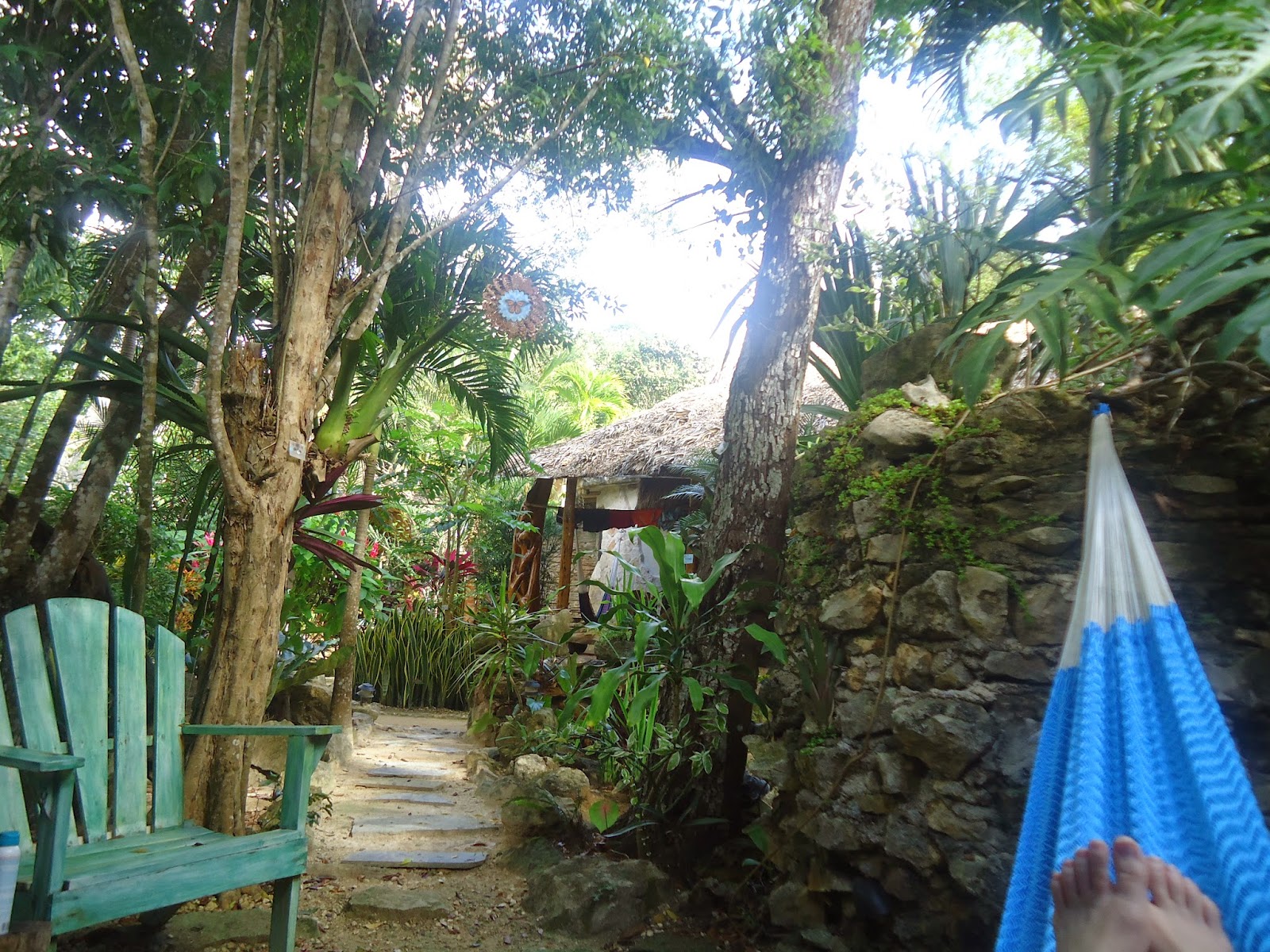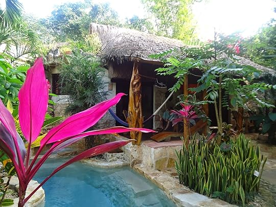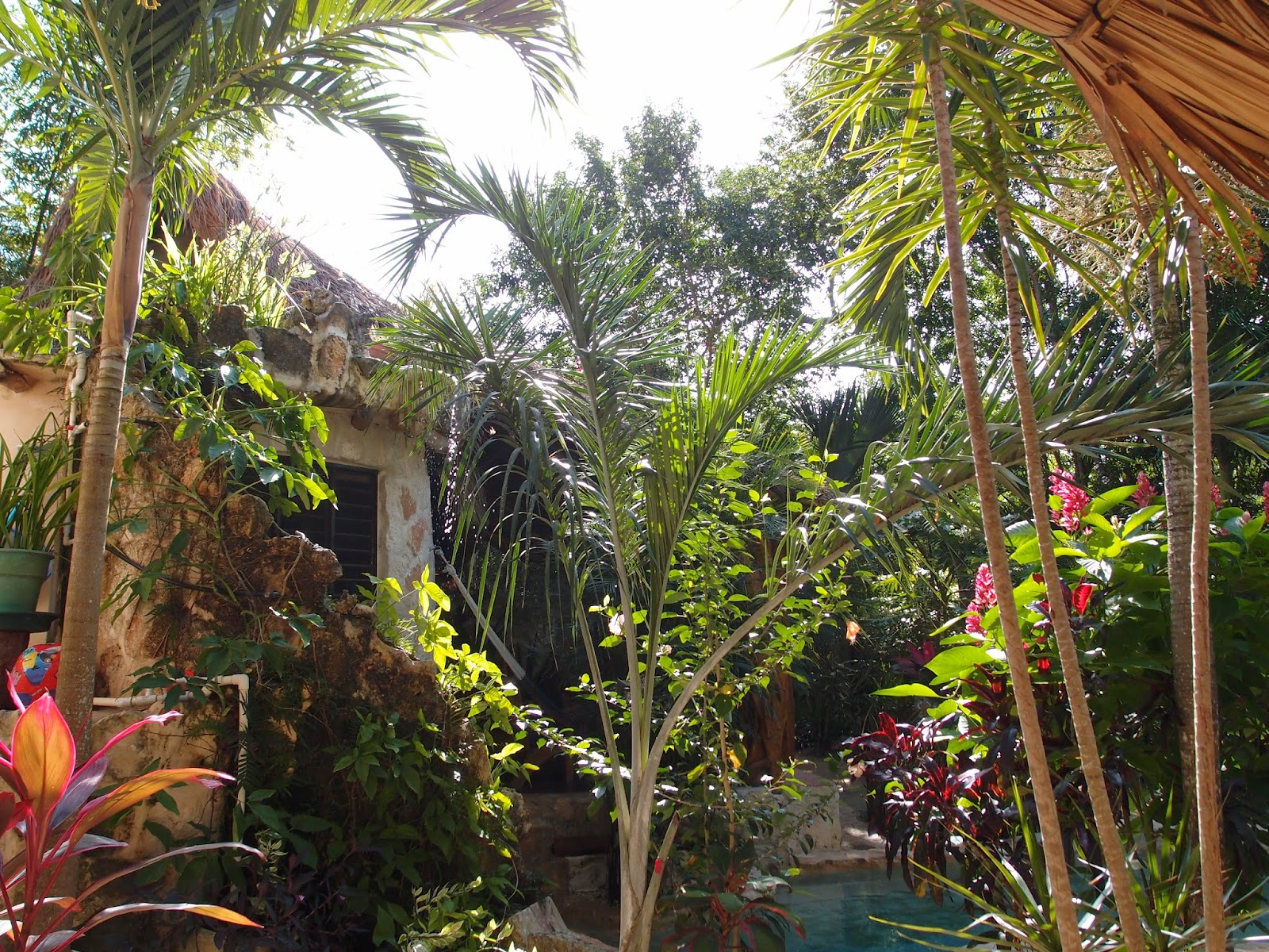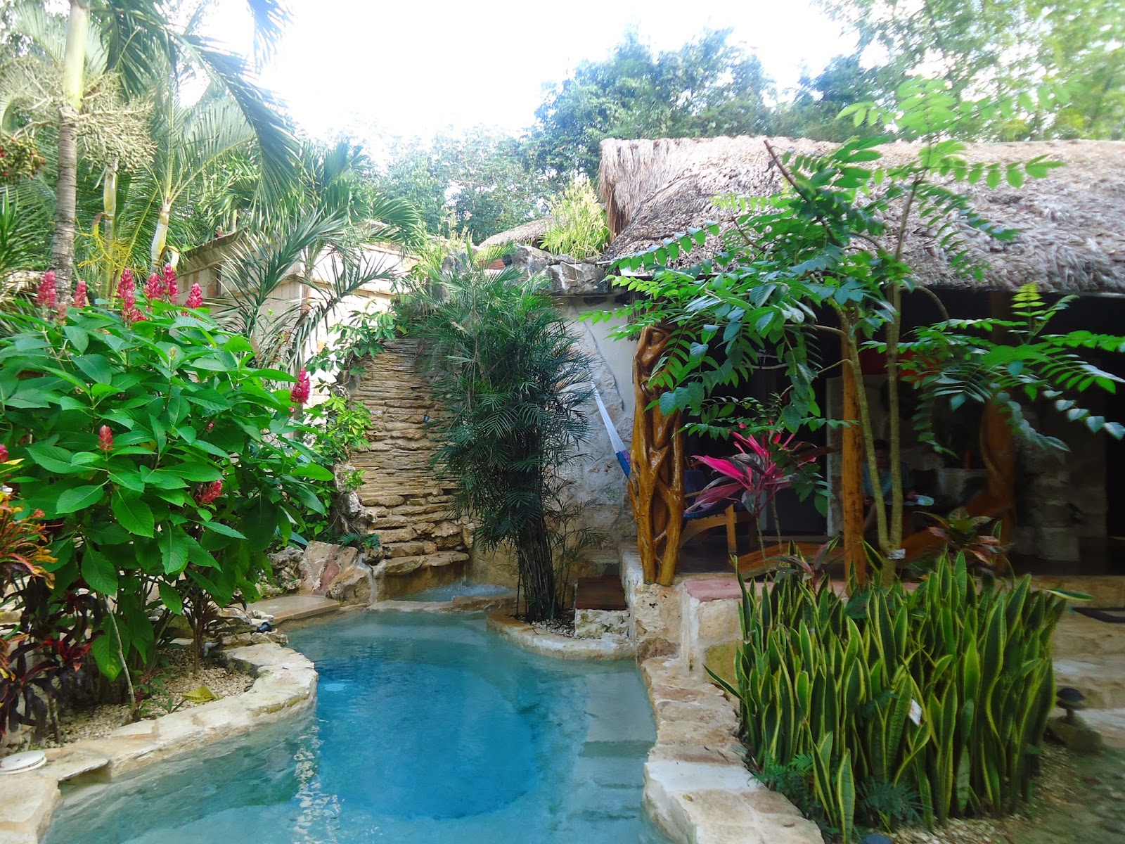 The place is in a rural area, on several beautiful acres of forested land, with a few cabanas for guests and an open-air dining area. There were several private or shared "cenotes" on the property that you could swim in-- we shared ours with our neighbors. The little blue pools were human-made, but very rustic-looking, with waterfalls and stones and gardens. The water came from underground, where there are springs and caves and real cenotes. (And we actually did snorkel in real cenotes one day-- three deep caves near Coba... so magical.)