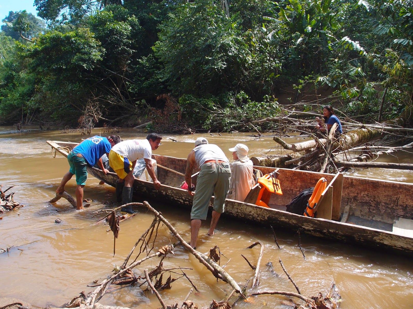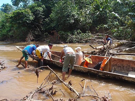 Sometimes, the canoe got stuck on debris in the river. Here, the guys managed to wiggle it free, but still couldn't get it past the fallen trees. So they pushed it back upstream a bit, and then revved the engine at full blast and let 'er rip... The canoe did a pop-n-wheelie right over the logs. (The rest of us were watching onshore, but the older British lady stayed in the canoe, because it would've been hard for her to get out in the middle of the river... she ended up getting an unexpected adrenalin rush.)