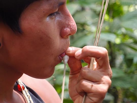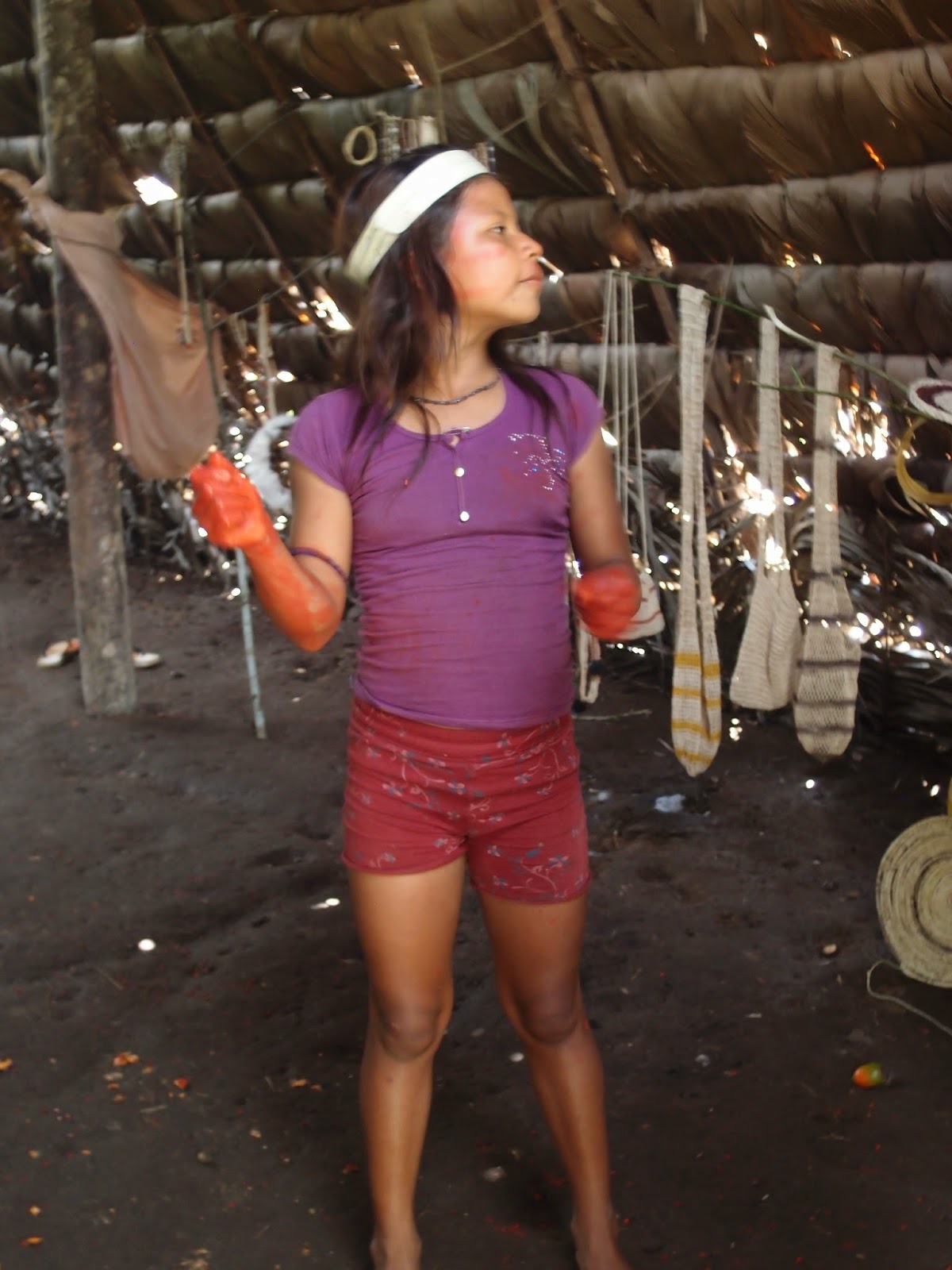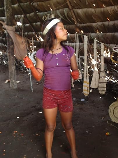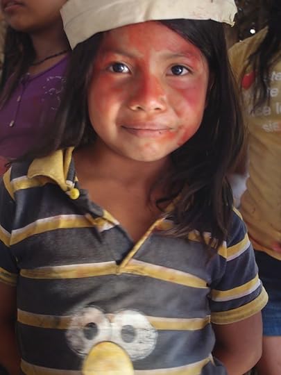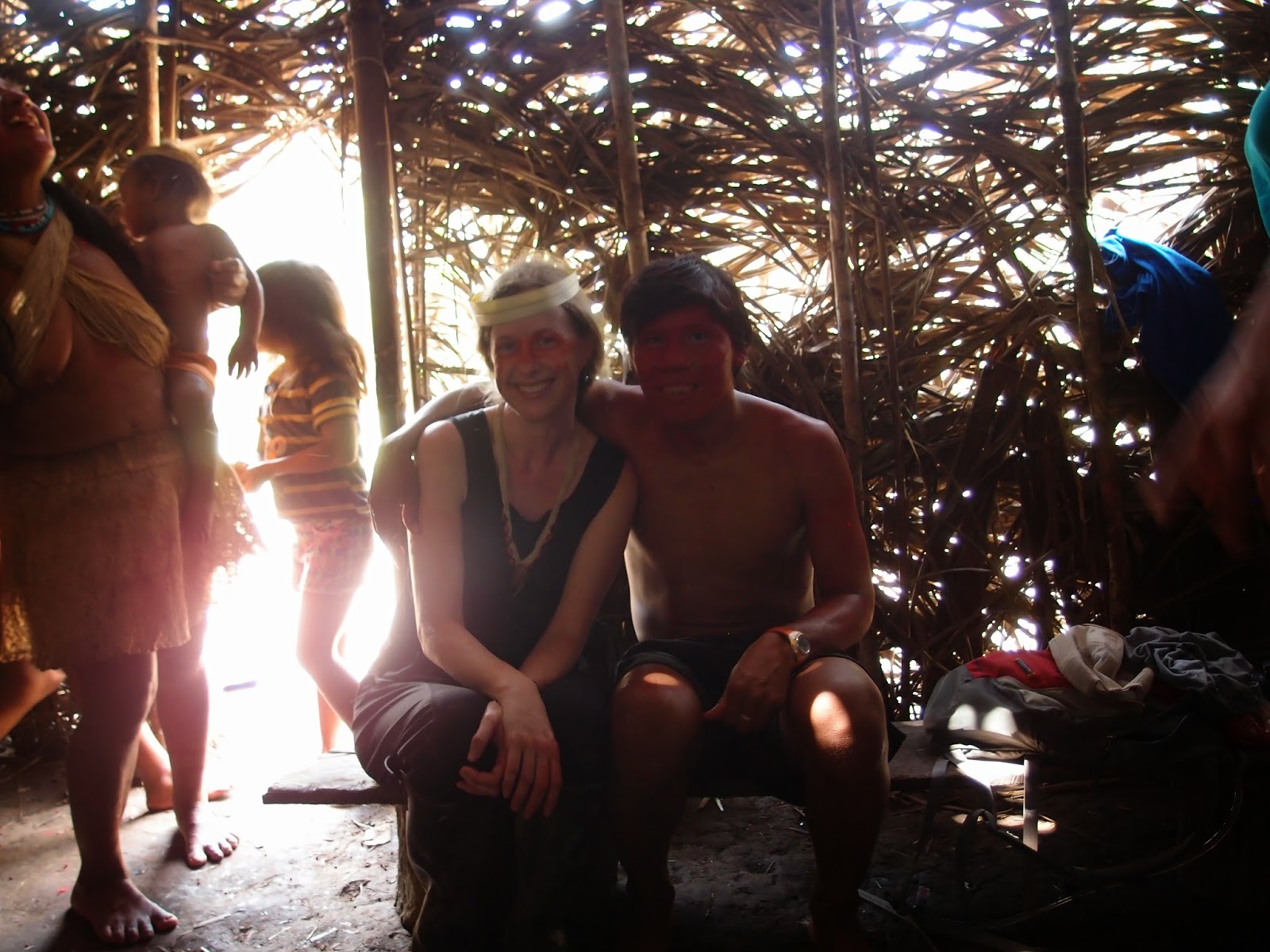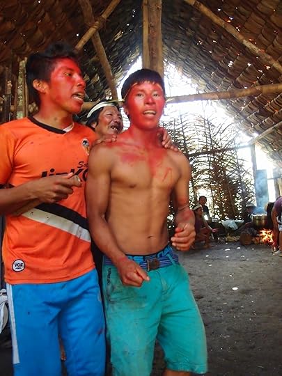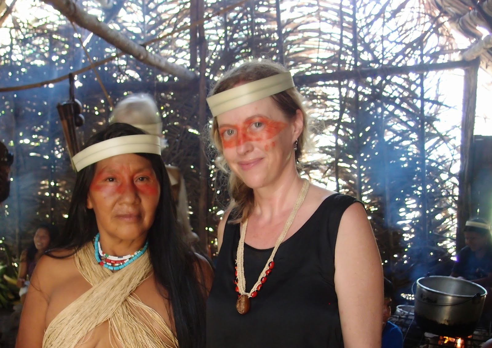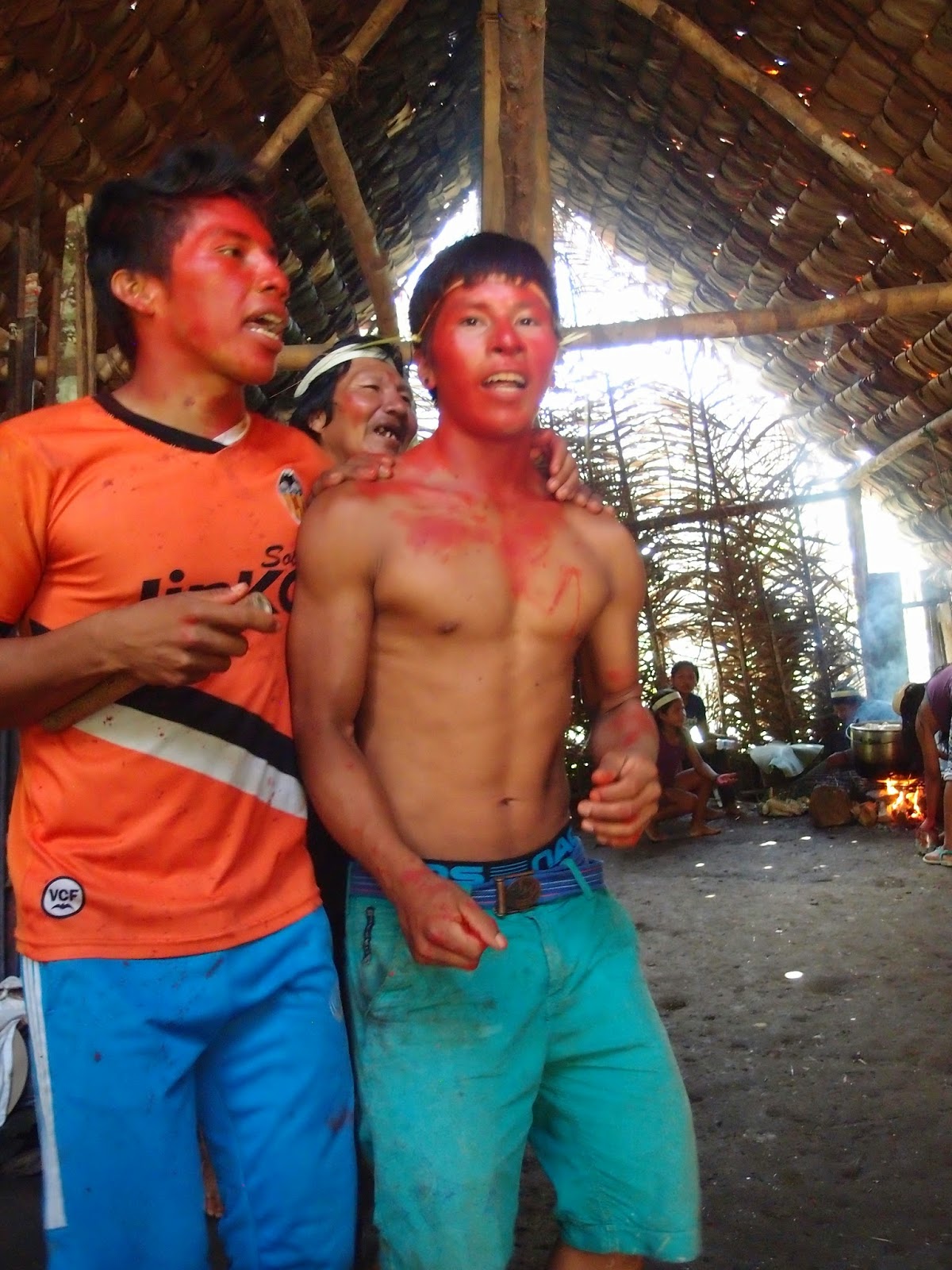 The face paint is achiote, which is a bright red edible seed, used in many dishes in Latin America. For face paint, they took achiote seeds and rubbed them in their hands with a little water, then rubbed in on their skin. They performed a traditional wedding dance, which is done at the annual Waorani celebration when many different Wao communities get together for celebration (I think it's around early March.)