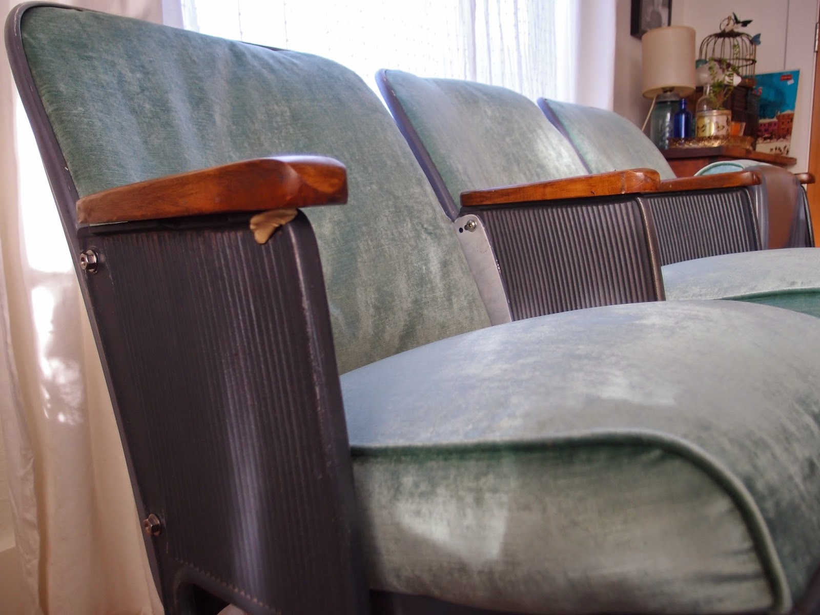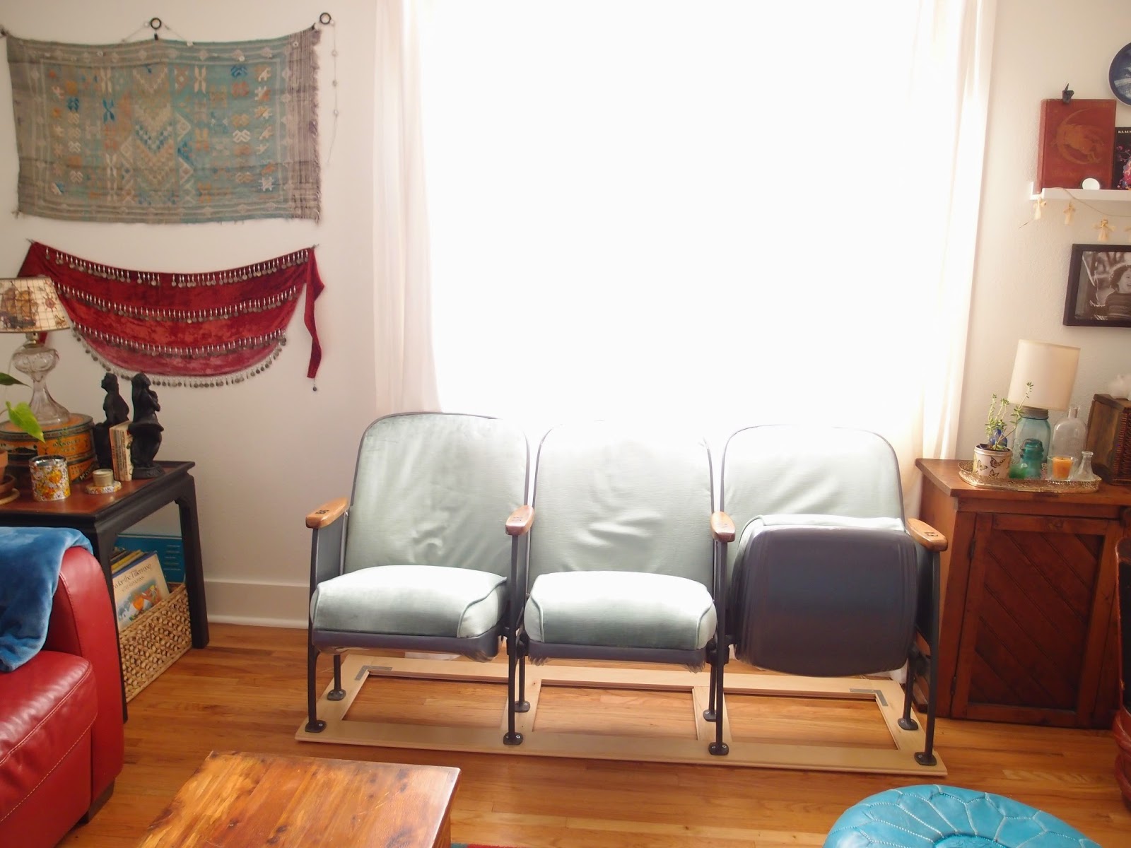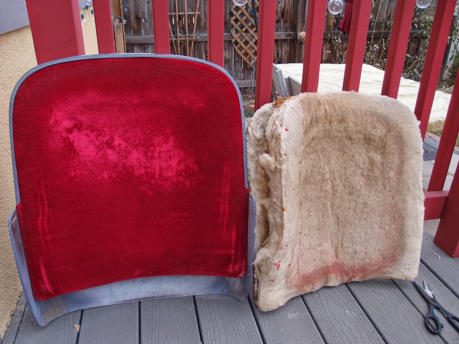They came from the local old Bas Bleu theatre on Pine street here in Fort Collins, before the theatre moved. (We think that they're from the 1940's-- their original home was a theatre in small town eastern Colorado.) I had big dreams for these seats, but they sat in my garage collecting dust for three years....