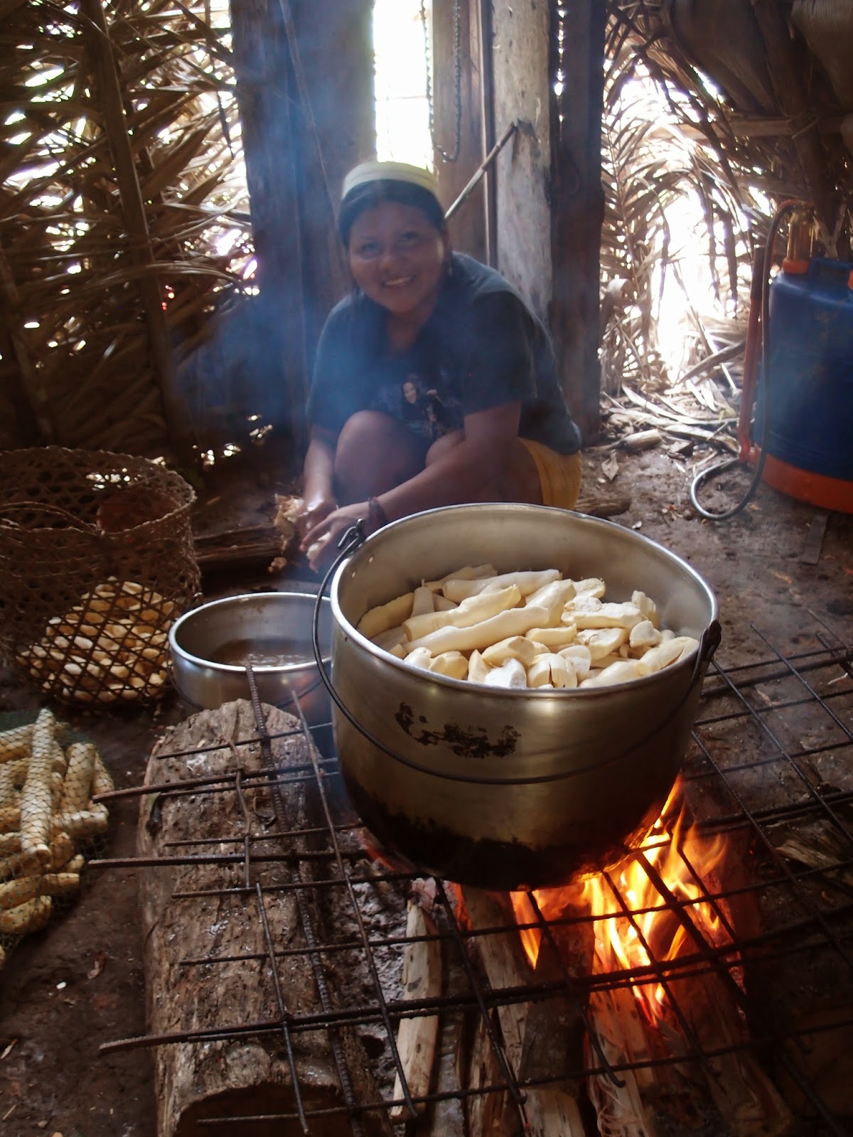 Peeling and boiling yuca, a step in the preparation of chicha, an important traditional drink. Later, it will be mashed and chewed up to be fermented with saliva.