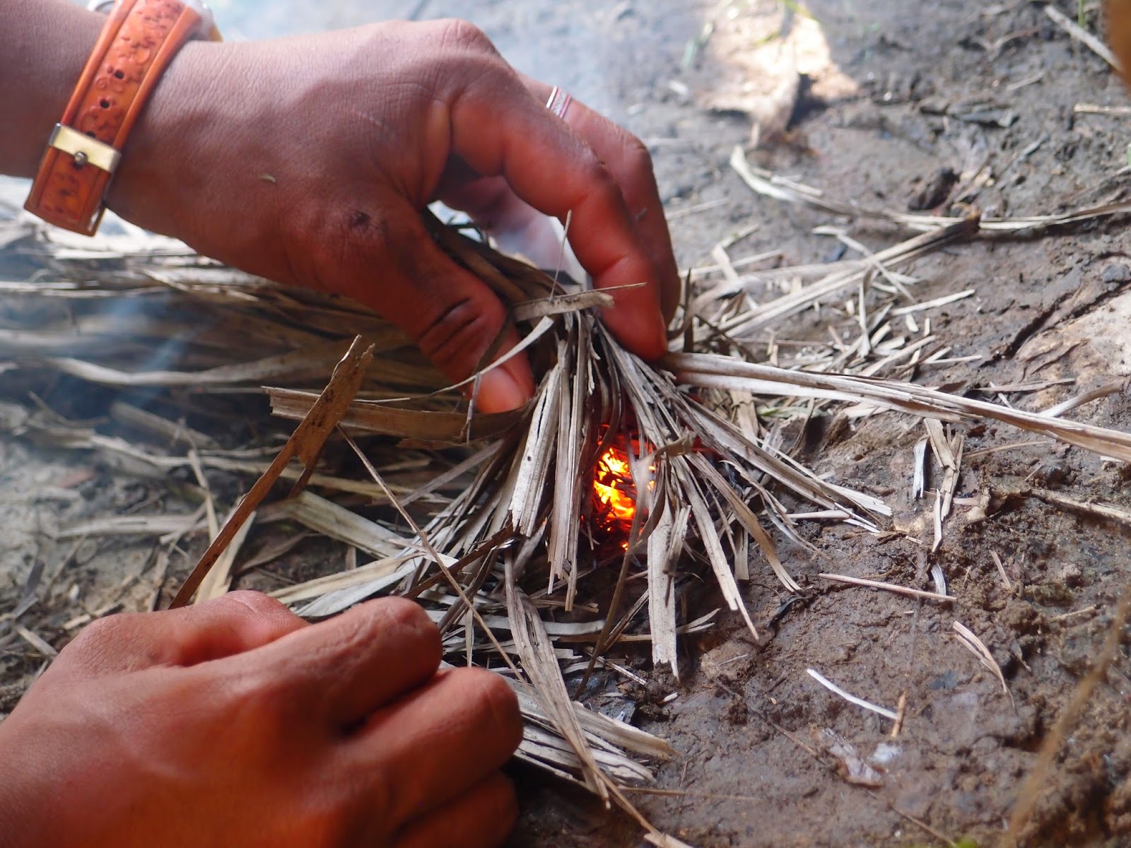 Here he is, spinning the stick, with its pointed end inside a hole, creating friction and heat. Pegonka is gently blowing, to give it oxygen.