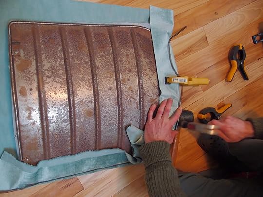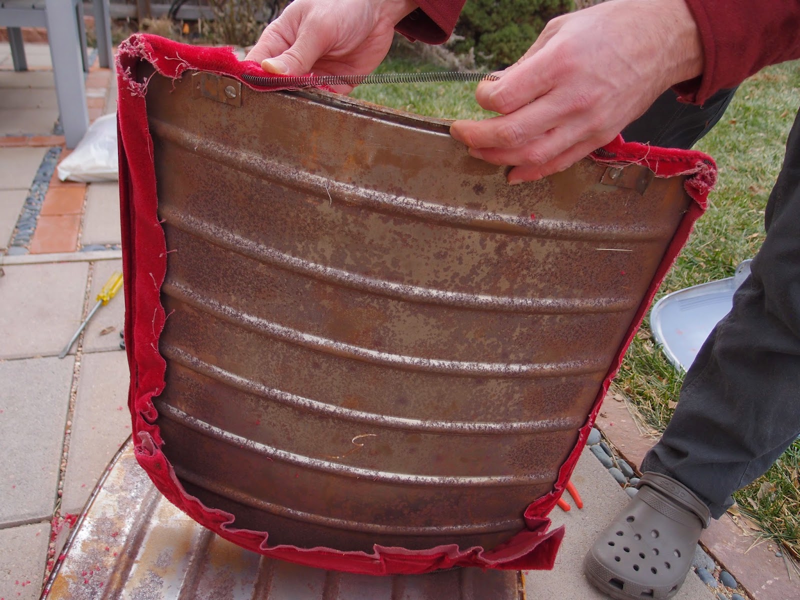 I glued two layers of Dacron to the metal back (and glued them together, too.) Then Ian and I wrapped the new velvet around the metal and cushion, which was a bit challenging because we had to wedge it in with that tiny, long slinky. We accomplished this with a hammer, mallet, clamps, and Ian's brute force.