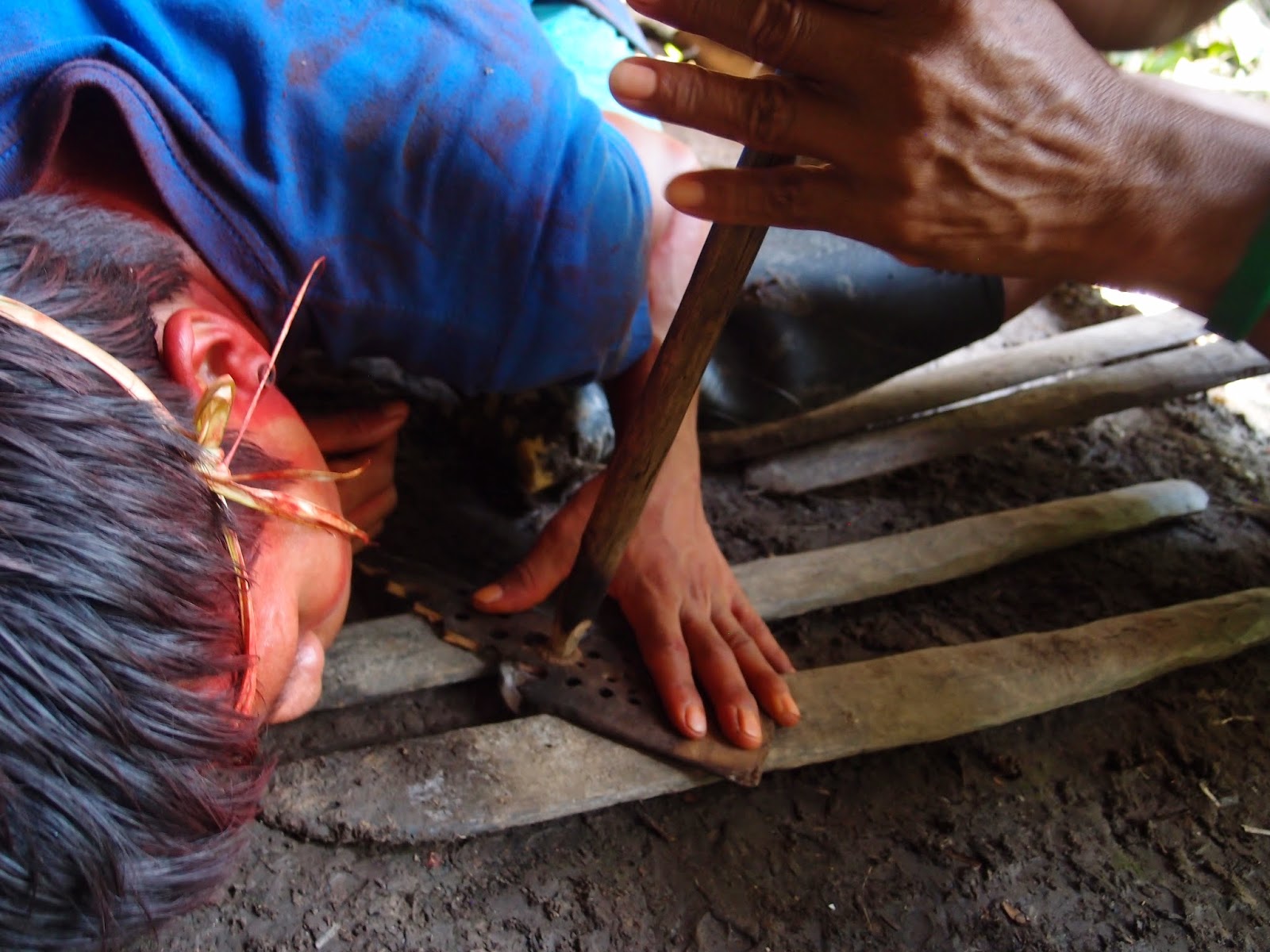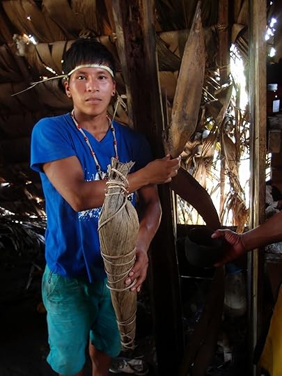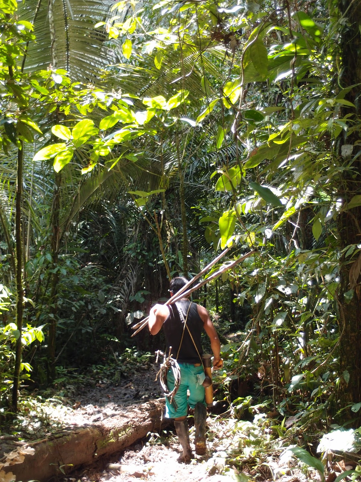 Here's Pegonka (my awesome guide), explaining how the poison from the liana is prepared for the blow dart guns. Basically, as I understand it, the liana (a kind of vine) is ground up and wrapped in palm leaves. Then water drips slowly into the top, and works its way down through the poisonous ground liana and absorbs some of the poison on the way. Then the poisoned water drips into a container. Then it's treated over the fire to create a kind of resin that Pegonka carries with him while hunting.
