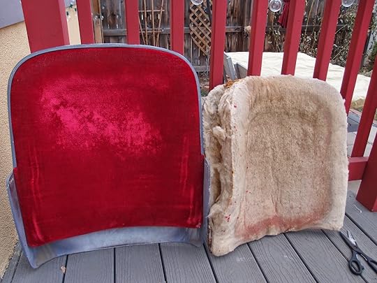 I found some gorgeous, silky-smooth velvet fabric remnants super-on-sale at fabricguru.com. Gayle did a beautiful job sewing the velvet for the seat, which I couldn't do with my limited sewing skills and non-upholstery-grade sewing machine. Then she provided the foam and Dacron wrap for me and guided me through reassembling the seats. (I think the foam was about 4 inches thick-- I glued a layer of Dacron to it with spray fabric adhesive.)
