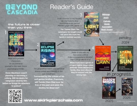 The good news is that Book Six, "Shadowminds," is proceeding much faster. It will be a shorter novel, but it is fully outlined, with significant portions already drafted. So that one will actually be done, God willing, months ahead of my original publishing schedule! I am on track to completing the entire seven-part Beyond Cascadia series on my original timeline, and I want to thank everyone for their patience and support along the journey.