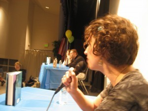 Here's my friend and fellow author, Sheila Nielson, answering a question in one of the assemblies. Kristen Chandler and Clint Johnson are in the background.