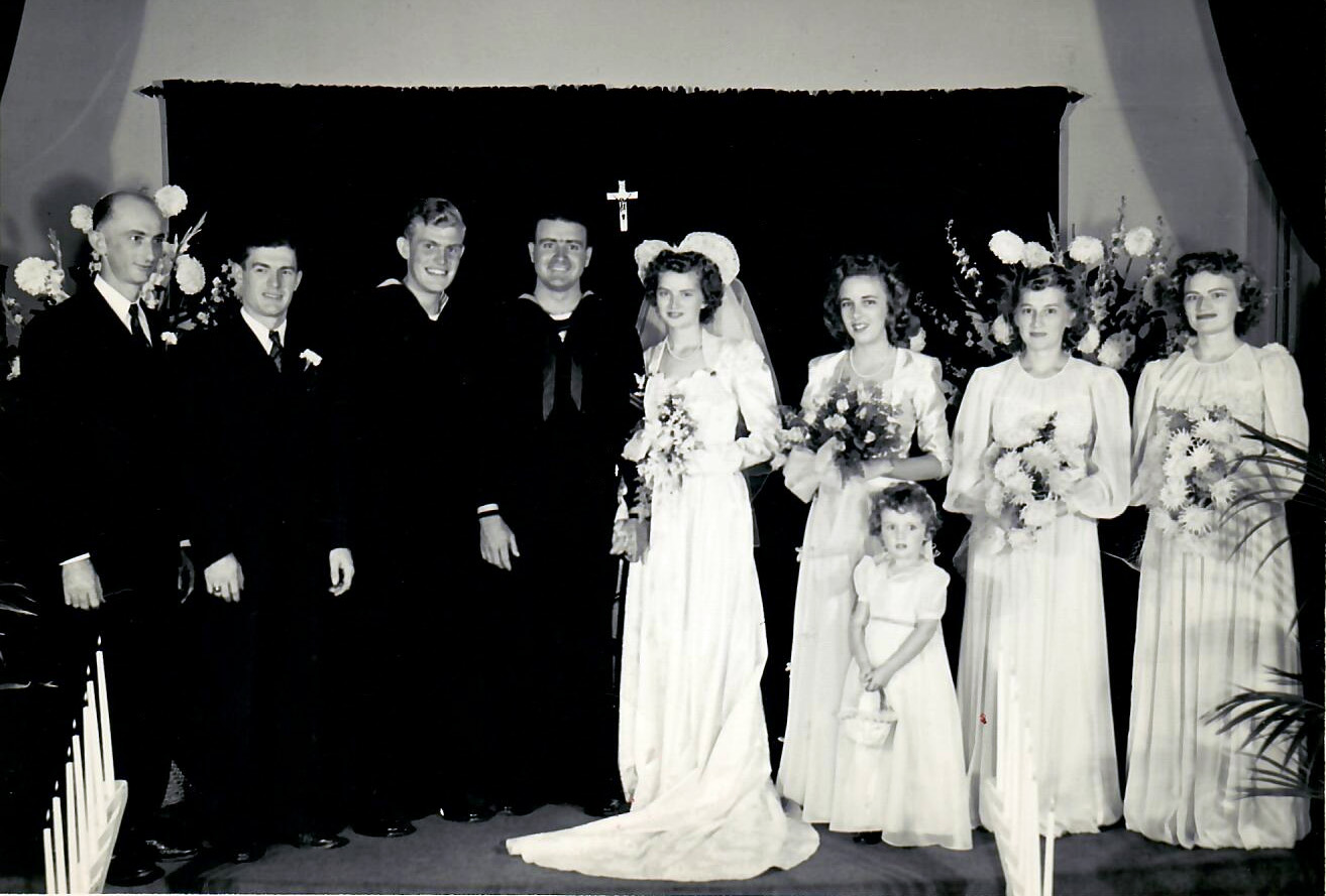 She wore a handmade gown of satin brocade, and non-rationed canvass sandals. Grandpa of course wore his Navy uniform.