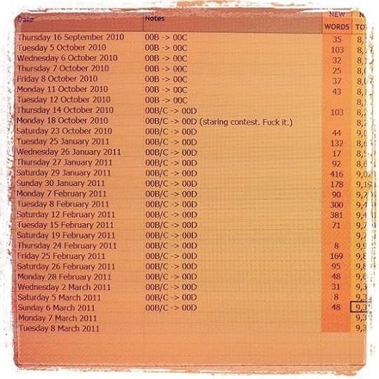 Last night I got the structure all but nailed down (albeit with an awful lot of white space in the manuscript which is nothing more than the note GET HIM OUTSIDE NOW, or some other such crossing-the-room instruction); tonight I get to trawl through and put in all those room-crossings and transitions.