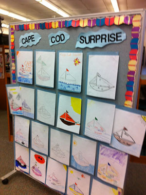 Yesterday I visited the Bourne Middle School, writing Oliver-based stories in cooperation with about 230 fifth graders—who fortunately were divided across five forty minute periods, and well-supervised by their teachers. First the kids chose a starting and ending point for our story and located each on a chart of Buzzards Bay, establishing our setting. Then I laid down two ground rules: Oliver can't die, and the schooner Surprise (represented by a not-to-scale homemade replica: see photo below) couldn't sink. Other than that, it was up to them to write the story.