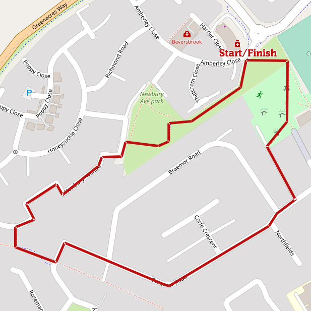2) Exit the park on via the western path and continue in a westerly direction through Newbury Avenue.