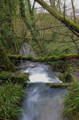 7) From this point on, listen out for the river. You will soon come to a bridge. The weir on the western side turns the river into a rushing torrent, even at this close proximity to the source. Excess water often pours out of the hills near the source adding to the flow the runs to the reservoir.
