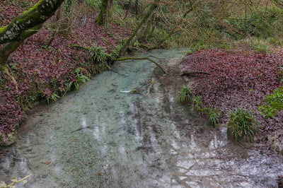 11) Along your left is the steep drop to the source of the River Marden, which can be glimpsed between the trees. The gate to the source of the Marden is always unlocked, however there is no formal public access to this land, which, along with the reservoir is owned by the Bowood Estate.To your right you will see a beautiful piece of land, called Blackham bottom in the 1800s, and now goes by the name of Bacon Bottom, possibly a corruption of the earlier name. It is often filled with sheep, making it even more picturesque.