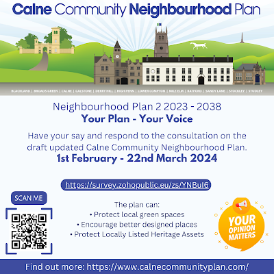 This is part of our Regulation 14 consultation that is running between 𝟏𝐬𝐭 𝐅𝐞𝐛𝐫𝐮𝐚𝐫𝐲 - 𝟐𝟐𝐧𝐝 𝐌𝐚𝐫𝐜𝐡 𝟐𝟎𝟐𝟒 Your concerns and comments will help improve and finalise a Plan that gives our community a proactive and strong voice in the planning and development and protection of the town, villages, and natural environments of the Calne Community Plan Area. We also look to formalise the recognition of local historic assets and to ensure that we keep the 25% of Community Infrastructure Levy planning charge rather, which will drop to 15% without a Neighbourhood Plan.Find out more by visiting: https://www.calnecommunityplan.com/ 𝐂𝐨𝐦𝐩𝐥𝐞𝐭𝐞 𝐭𝐡𝐞 𝐬𝐮𝐫𝐯𝐞𝐲: https://survey.zohopublic.eu/zs/YNBuI6Check out our latest leaflet: https://bit.ly/CCNPR14Come along to one of the face-to-face events𝐅𝐫𝐢𝐝𝐚𝐲 𝟐𝟑𝐫𝐝 𝐅𝐞𝐛𝐫𝐮𝐚𝐫𝐲 - 𝟏𝟓.𝟑𝟎 - 𝟏𝟖.𝟑𝟎 𝐂𝐚𝐥𝐧𝐞 𝐋𝐢𝐛𝐫𝐚𝐫𝐲𝐒𝐚𝐭𝐮𝐫𝐝𝐚𝐲 𝟐𝟒𝐭𝐡 𝐅𝐞𝐛𝐫𝐮𝐚𝐫𝐲 - 𝟏𝟎.𝟑𝟎 - 𝟏𝟒.𝟎𝟎 𝐂𝐚𝐥𝐧𝐞 𝐓𝐨𝐰𝐧 𝐇𝐚𝐥𝐥𝐒𝐚𝐭𝐮𝐫𝐝𝐚𝐲 𝟐𝐧𝐝 𝐌𝐚𝐫𝐜𝐡 - 𝟏𝟎.𝟑𝟎 - 𝟏𝟒.𝟎𝟎 𝐋𝐚𝐧𝐬𝐝𝐨𝐰𝐧𝐞 𝐇𝐚𝐥𝐥, 𝐏𝐞𝐫𝐫𝐲 𝐋𝐚𝐧𝐞, 𝐃𝐞𝐫𝐫𝐲 𝐇𝐢𝐥𝐥
