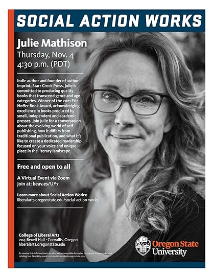 Whether you're a reader, a writer, or just curious about the changing face of publication, please join me on Zoom, Thursday, November 4th at 4:30 pm. (PST) for a conversation about writing, publishing, owning your voice and following your dreams. This free event is part of the Social Action Works series through Oregon State University’s College of Liberal Arts — open to all. Hope to see you there!