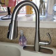 A couple years ago we bought a new faucet for the kitchen sink. It had the finish we like that tied in with the other plumbing in the house. It is Moen with is a brand I have had a lot of confidence in for years. The faucet is one that comes straight up from the top of the sink, then curves forward and down. We picked this one for another reason: the bend did not cause the end of the faucet to extend far into the sink.