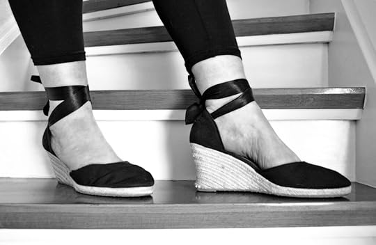Three inch rope souls, black canvas with a satin ribbon tied around the ankles.