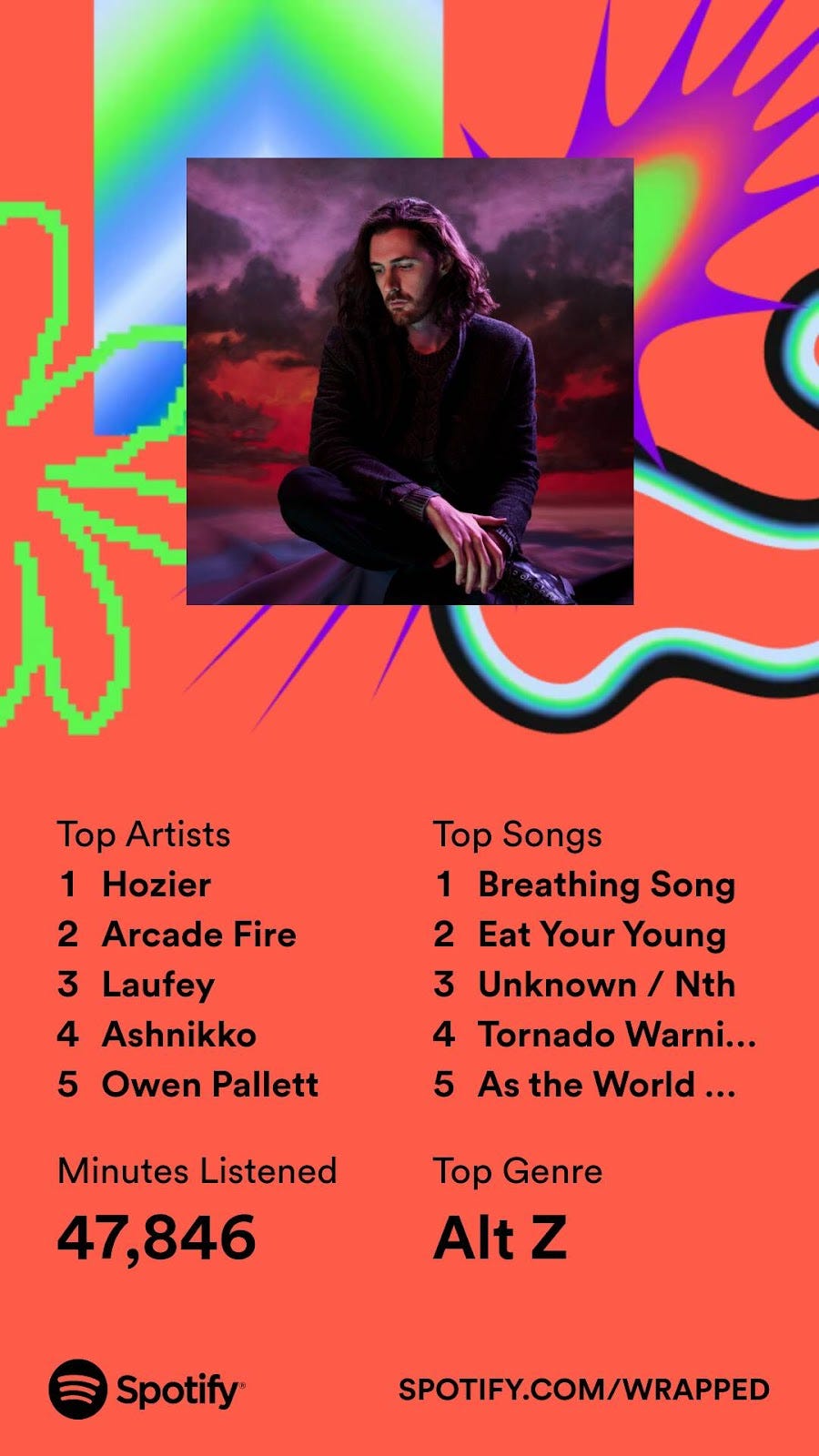 Hello, December! It’s almost the end of 2023, and you know what that means—Spotify Wrapped! I’ve been waiting ages for this, even though I knew it would be predictable. Every year, it’s the same. But every year, I’m pleasantly surprised that I continue to be a massive stan. That’s right, Hozier; I’m once again in the top 0.1 percent of listeners, and yet, you still don’t notice me.